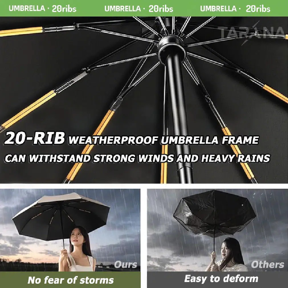 এই umbrella-টির সবচেয়ে বড় বিশেষত্ব হলো এর 20 ribs storm resistant design, যা শক্তিশালী বাতাসেও umbrella কে স্থির রাখে। সাধারণ umbrella যেখানে সহজেই উল্টে যায়, সেখানে এটি দৃঢ়ভাবে টিকে থাকে।